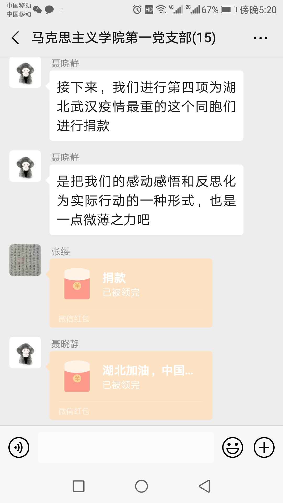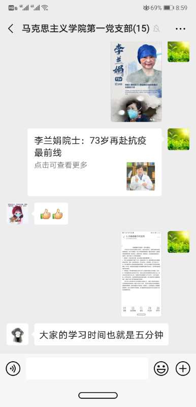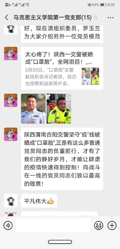 随后,第一支部支委聂晓静、罗玉兰、徐凌美、王真分享了搜集到的疫情期间党员先锋模范事迹,其中既包括了以钟南山院士、李兰娟院士为代表的抗疫一线优秀党员,也包括了以陕西本地为代表的基层优秀党员。第一支部党员们在学习完先进党员事迹后,大家感触颇深,纷纷表达对于抗疫英雄的崇敬之情并微信群中写下了自己的学习感受。王红梅表示在抗击疫情的关键时期,要坚决地毫不动摇地用马克思主义方法论来指导抗击肺炎,最终获取全面胜利。刘晓勇表示广大思政课教师要认真响应中央号召,发挥自身优势,积极担当作为,要当好广老员工的引路人,要当好中央政策的宣讲者,要当好共产党员的司号员。张全省表示要学习领会研究宣传好习近平重要讲话精神,做好本职工作,教育好员工听党话跟党走,为夺取疫情防控战役最后胜利贡献自己的力量。张缨表示要坚决拥护党中央英明决策和部署,向战斗在疫情一线的模范人物学习,做好自己的本职工作。韩静表示作为思政课教师要抓住这场现实的思政课,鲜活的思政课中的典型事例,把中国特色社会主义理论特色和制度优越性在课堂上充分展现出来。张红艳表示国家有难,报国不分职业,作为一名思政课教师党员要站好教育一线的岗。讨论结束后,第一支部全体党员积极踊跃为疫区捐款,为打赢疫情防控阻击战贡献自己的力量。