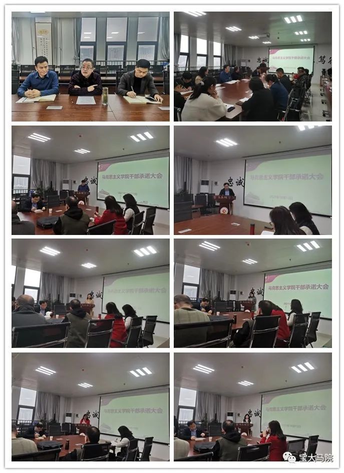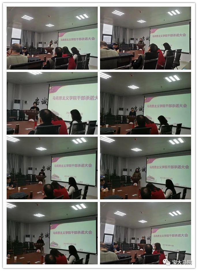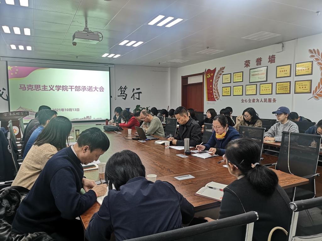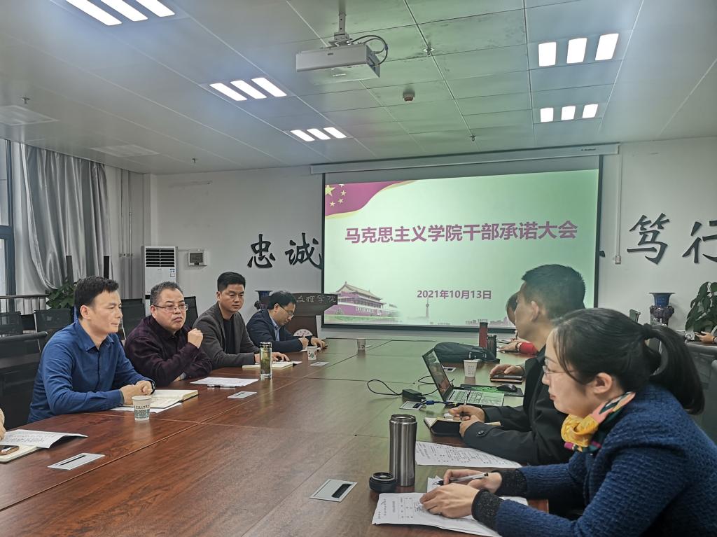 干部承诺工作旨在提高全院干部队伍责任意识和担当意识,形成主动作为和简单清新的工作氛围,为马院高质量发展提供有力保障。承诺对象为:公司领导班子成员,办公室负责人、陕西省重点中国特色社会主义理论体系研究中心(宝鸡基地)副主任、三种文化协同育人思想政治教育研究基地副主任、宝鸡市干部培训中心高校基地主任、各教研室负责人、工会负责人、教工第一第二党支部书记。承诺内容围绕3大方面、7项具体内容进行:一是工作思路方面,主要围绕本学期岗位职责范围内的工作重点、工作方法、工作目标3项具体内容进行承诺;二是模范引领方面,主要围绕个人在教学引领和科研示范2项具体内容进行承诺;三是工作作风方面,主要围绕个人在廉洁从教、达己成人2项具体进行承诺。所有承诺内容均以具体指标量化,并在学期末干部述职大会上进行承诺兑现,接受全体教师监督检查。
