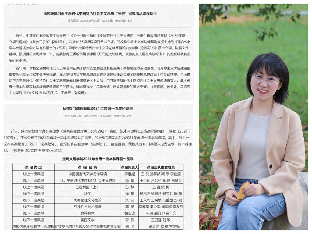 公司以精品课程建设为抓手,开展新一轮课程改革与建设工作。7月初,杨蕾副教授主持的《习近平新时代中国特色社会主义思想》获批省教育厅2021年省级一流本科课程。9月底,杨蕾副教授主持的《混合式教学与专题式教学方法有机融合的<毛泽东思想和中国特色社会主义理论体系概论>教学模式创新研究》获批省委教育工委习近平新时代中国特色社会主义思想“三进”省级精品课程项目。两门省级一流本科课程和省级精品课程项目的获批,标志着公司习近平新时代中国特色社会主义思想“三进”工作再上新台阶,标志着公司“思政金课”建设取得重大突破。
