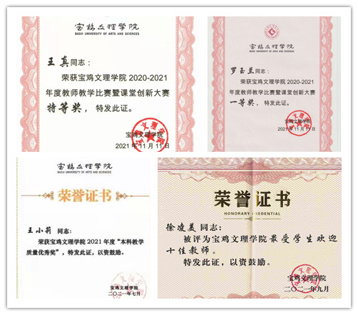 11月6日,王真、罗玉兰分别荣获公司2020-2021年度教师教学比赛暨课堂创新大赛特等奖、一等奖。11月底,王红梅、王真经过选拔,获得参与陕西省高校课堂教学创新大赛资格。公司获得课堂创新大赛“优秀组织奖”。12月初,傅文、罗玉兰、王真通过2021年陕西高校思政课教师“大练兵”网上评审,获得决赛资格,思政课教师“大练兵”初赛成绩历年最好。徐凌美荣获2021年度“最受员工欢迎十佳教师”,罗玉兰、王小莉荣获2021年度“本科教学质量优秀奖”。聂晓静和韩静、朱慧芸、王丽娜分别获批第十六批校级教学改革重点和一般项目。一年来,学院以“一室一品”教学改革为主战场,以“精彩一课”教研活动为突破口,以“优秀教师传帮带”为着力点,以“混合式”“专题式”教学改革为依托,激发了全体专兼职思政课教师的内生动力,新进教师漆文娟、赵云嘉、陆贝贝教学能力明显进步,全体教师教学综合能力明显提高。