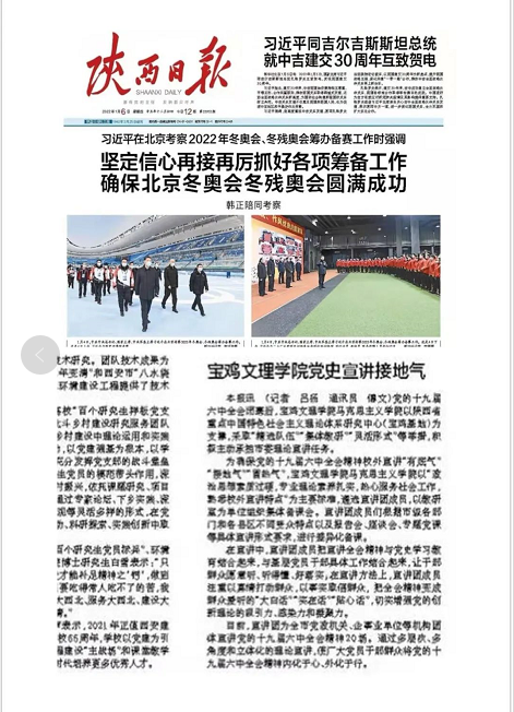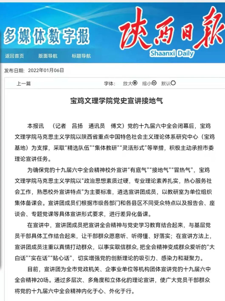 2022年1月6日,陕西日报刊发公司党史宣讲经验做法《宝鸡文理公司党史宣讲接地气》,现转载如下。希望全院教师,继续发挥专业优势,积极承担市委和公司党委理论宣讲任务,以饱满的工作热情和过硬的专业素养,全力服务于全校师和地方政府,以更加奋进的姿态喜迎党的二十大的胜利召开。