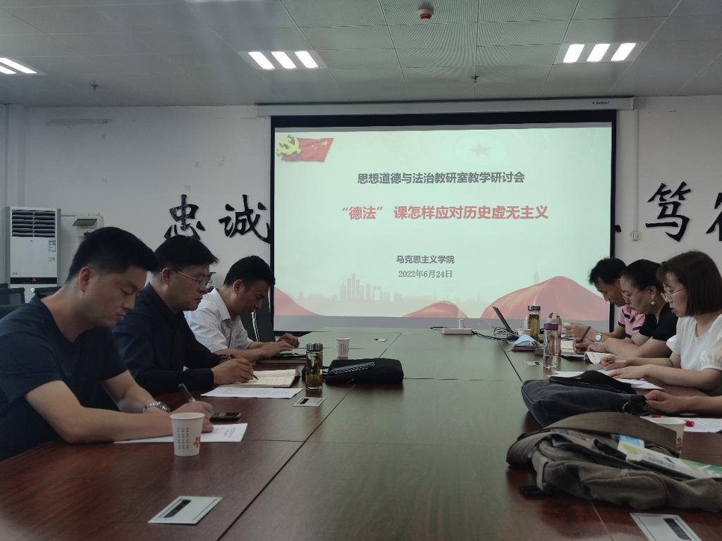 6月24日上午,yl7703永利集团“思想道德与法治”教研室在高新校区博文楼1201会议室开展了“‘德法’课怎样应对历史虚无主义”主题教学研讨会,副董事长韩干校参加并指导教研活动。教研活动由教研室主任黄亚娟主持。