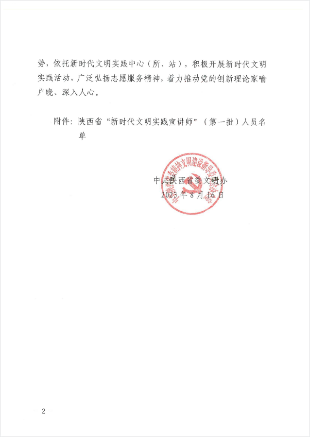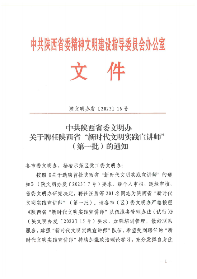 为深入学习贯彻习近平新时代中国特色社会主义思想,打造高质量的新时代文明实践宣讲师队伍,推动党的创新理论家喻户晓、深入人心,省委文明办在全省范围内组织开展了首批陕西省“新时代文明实践宣讲师”选聘活动。经过逐级推荐、审核甄选,省委文明办近日印发通知,聘任201名同志为陕西省“新时代文明实践宣讲师”。