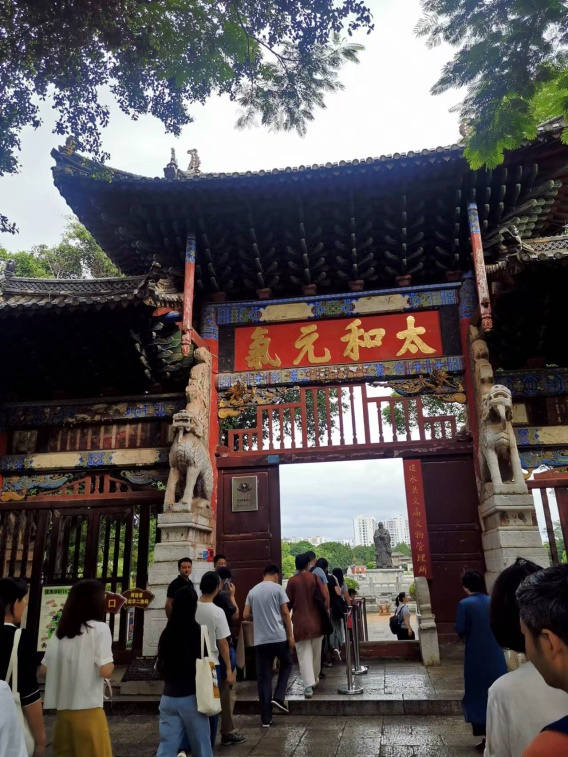 建水文庙,位于古城西北,是中国第二大文庙。走到文庙正门,老师让我们注意一块题有“太和元气”的牌匾,这里面自然有玄机!进入文庙,一大片椭圆形的湖水映入眼帘,名叫学海,也是文庙的性情空间。老师说,前几年,湖中满是荷花欣欣向荣,可惜被不懂文化的管理者人尽数拔去;学海前,又添置了一座不该出现在大门口的孔子像(孔子像一般坐落在文庙最靠后的大殿方显其分量);学海后,也多修了几座遮挡视线的亭子。老师说,这些添加删减都影响了文庙的气象,随后便指点我们看这座文庙该有的真正气象。学海尽头是礼门,迈上三级台阶进入礼门就是礼教空间。老师带我们走进礼门,站在“万世宗师”的牌楼下,此处是两条中轴线的交汇地,左右两边是一对对称的牌楼,左边题着“道冠古今”,右边题着“德配天地”;在交汇点向身后望去,正是那团翠玉般的学海;再往远处眺望,连绵的苍山巍峨屹立,天边白云滚滚。老师让我们想象,若是把学海上的违章建筑和塑像都搬走,我们站在此处正好能看见正门“太和元气”的匾额;若是再添上一池曼妙的荷花,配上此地的山川美景,是何其开阔明媚的气象啊!来文庙拜谒圣贤的同时,被如此殊胜的气象滋养一番,足可令人心旷神怡,元气满满!如此,我们才能真实体会到古人题写“太和元气”匾额的意义。世间最好的景致,便是这天地与人文交相辉映的风光。