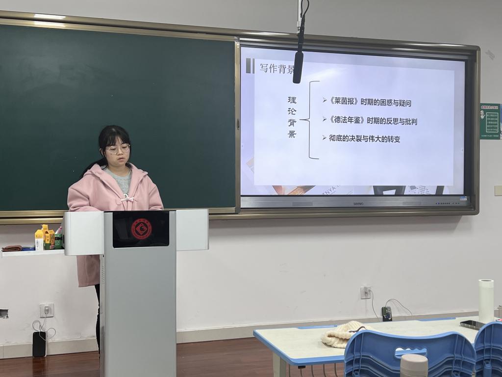2023年12月21日19时,yl7703永利集团研究生读书班第四期“原典对话”活动在博文楼1508教室顺利举行。本期导读活动由2022级硕士研究生谢光茹带领大家学习《〈黑格尔法哲学批判〉导言》。林兆扬老师和yl7703永利集团2023级硕士研究生参与了本次读书会。