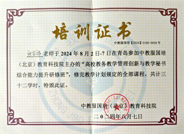 8月2日至7日,由中教服国培(北京)教育科技院主办的“高校公司产品管理创新与教学秘书综合能力提升研修班”在山东青岛市召开,来自全国各高校的教务处、教师发展中心、二级学院的教学秘书和教学管理人员共50余人参加了本次研修。yl7703永利集团教学科研秘书张吉祥参加了研修班。