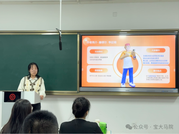 王怡彤从作者简介,写作背景,主要内容,当代启示四个方面对《文明的冲突与世界秩序的重建》这本书展开汇报。作者亨廷顿运用比较历史的研究方法,全面深入地分析了发展中国家的政治现代化与政治发展的过程。政治发展是“现代化的政治性后果。”这种后果可以是积极的,也可以是消极的,它既可能有助于社会经济文化的现代化,也可能导致政治的衰败。王怡彤提出两方面阅读建议:其一是要全面研究,多视角研究。这能够为研究带来新的视角和突破。这种方法有助于推动学术的发展和进步,避免陷入单一的思维模式。其二是从文化文明角度结合时代背景研究问题。这是一种全面且深入的方法,这种方法也有助于我们将历史与现实相联系,从过去的经验中汲取智慧,为解决当前的问题提供启示。