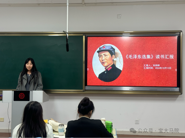 刘诗婷从作者生平、写作背景、读书方法、个人体悟及当代启示五个方面对《毛泽东选集》进行分享与汇报。她通过历史照片和作者诗词两个方面向大家展示了毛泽东的生平经历。刘诗婷建议按照时间线选择重要的篇章进行阅读,也可以辅以影视剧,如《恰同学少年》、《觉醒年代》、《建党伟业》等帮助阅读,提升兴趣。最后,她分享道:《毛泽东选集》中的智慧能够指导我们解决学习和生活中的问题,比如利用辩证的思维方式可以正确看待成功和失败,帮助我们建立理性思维。