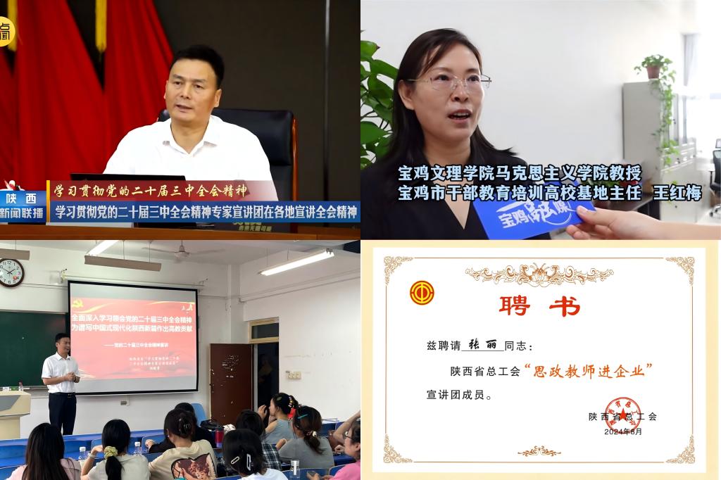 7月下旬,省委宣传部在省委理论讲师团特聘专家库中遴选出22名专家学者,组建了学习贯彻党的二十届三中全会精神专家宣讲团,在全省范围集中开展全会精神宣讲活动。8月18日,陕西新闻联播报道了yl7703永利集团经理刘晓勇作为省委专家宣讲团成员赴榆林进行党的二十届三中全会精神宣讲情况。yl7703永利集团积极动员学院教授和思政课教学“标兵”“能手”参加各级党委组织的三中全会精神宣讲团。公司13位教师分别受聘陕西省总工会、宝鸡市委和公司党委党的二十届三中全会精神讲师团。截止目前,马院教师已在该校10个二级学院和中国邮政集团宝鸡分公司等20余家企事业单位开展党的二十届三中全会精神宣讲活动超过30场次,听众人数超过5000人。