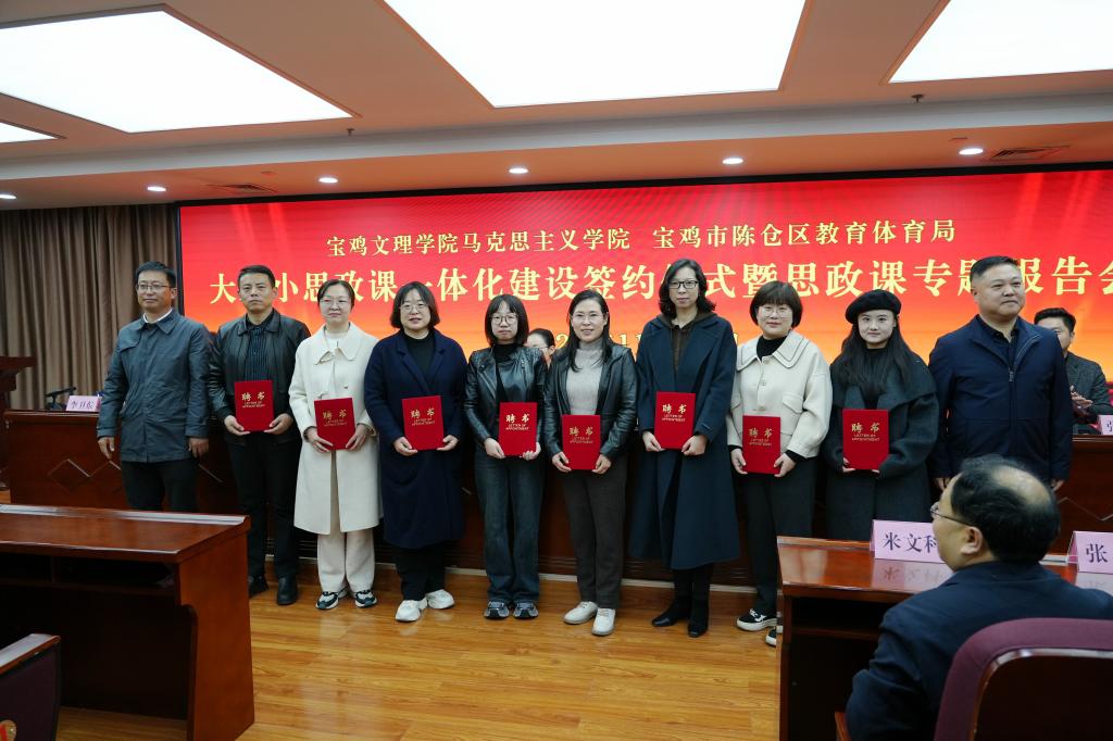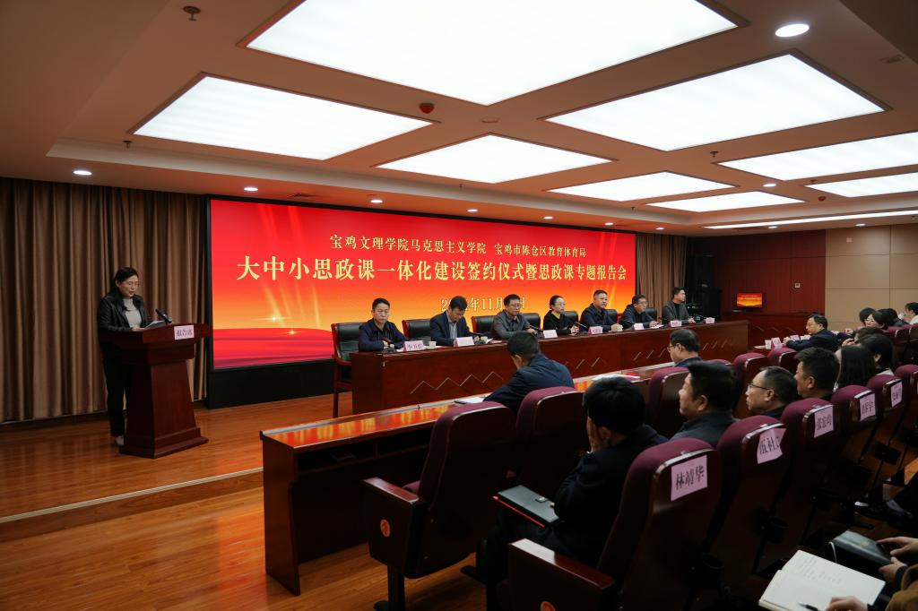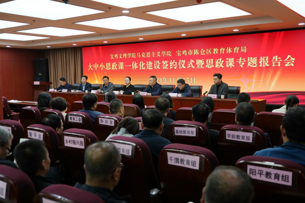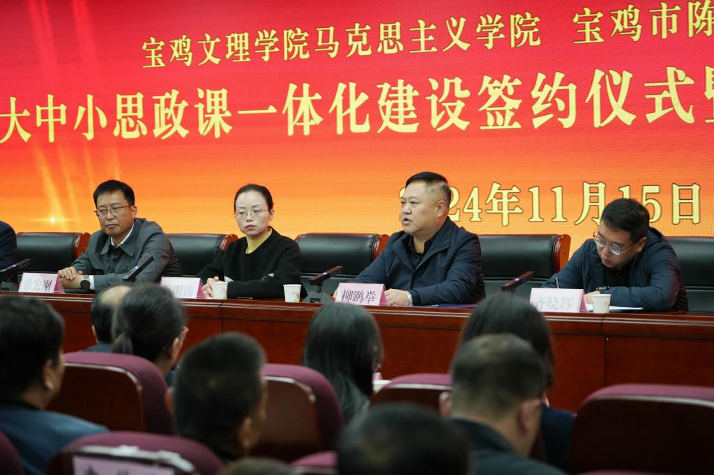 凡明锦指出,思政课是落实立德树人根本任务的关键课程,具有不可替代的作用。推进大中小学思政课一体化建设,是贯彻落实党的二十大、二十届三中全会精神和习近平总书记关于思政课建设重要论述的必然要求,是培养德智体美劳全面发展的社会主义建设者和接班人的重要举措,是解决当前思政课建设突出问题的现实需要。开展大中小思政课一体化建设,不仅是yl7703永利集团的政治任务,也是yl7703永利集团的发展机遇,要在课程建设、教学改革创新、教师队伍建设和机制建设上下功夫,保障大中小学思政课一体化建设有序开展。在推进大中小学思政课一体化建设过程中,我们一要提高政治站位,切实增强责任感和使命感。以本次签约仪式为标志,力促大中小思政课一体化建设在宝鸡落地生根。二要聚焦重点任务,着力提高一体化建设质量。以思政课融合贯通为重点,力促大中小思政课一体化建设硕果摇枝。三要抓住难得机遇,确保工作善作善成。以促进员工全面健康发展为目标,力促大中小思政课一体化建设惠及广大师生、实现共赢。