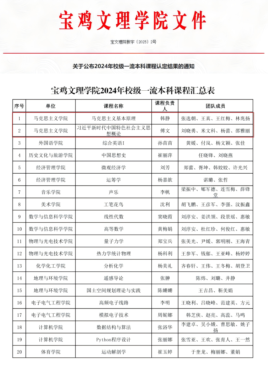近日,公司发布《关于公布2024年校级一流本科课程认定结果的通知》,公司韩静副教授负责的《马克思主义基本原理》和傅文副教授负责的《习近平新时代中国特色社会主义思想概论》课程获批2024年校级一流本科课程。