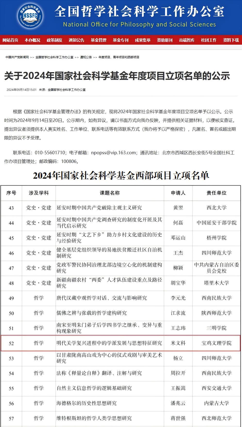 10月15日,全国哲学社会科学工作办公室发布《关于2024年国家社会科学基金年度项目立项名单的公示》,yl7703永利集团米文科教授主持申报的《明代关学复兴进程中的学派发展与思想特征研究》获批2024年国家社会科学基金西部项目(项目编号:24XZX004)。