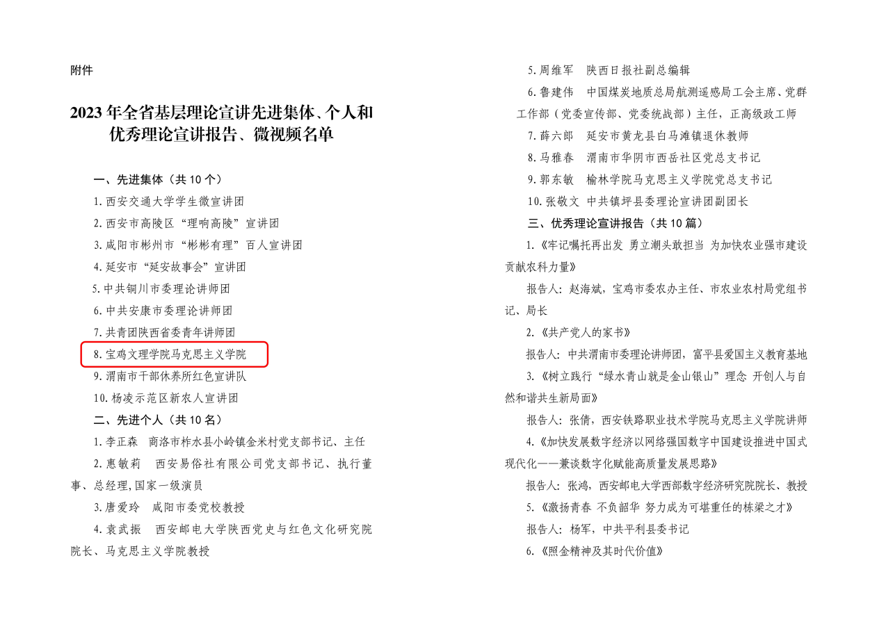 1月10日,中共陕西省委宣传部、中共陕西省委讲师团发布《2023年全省基层理论宣讲先进集体、个人和优秀理论宣讲报告、微视频名单公示》,公司yl7703永利集团获评2023年“全省基层理论宣讲先进集体”,成为全省高校唯一获得表彰的yl7703永利集团。