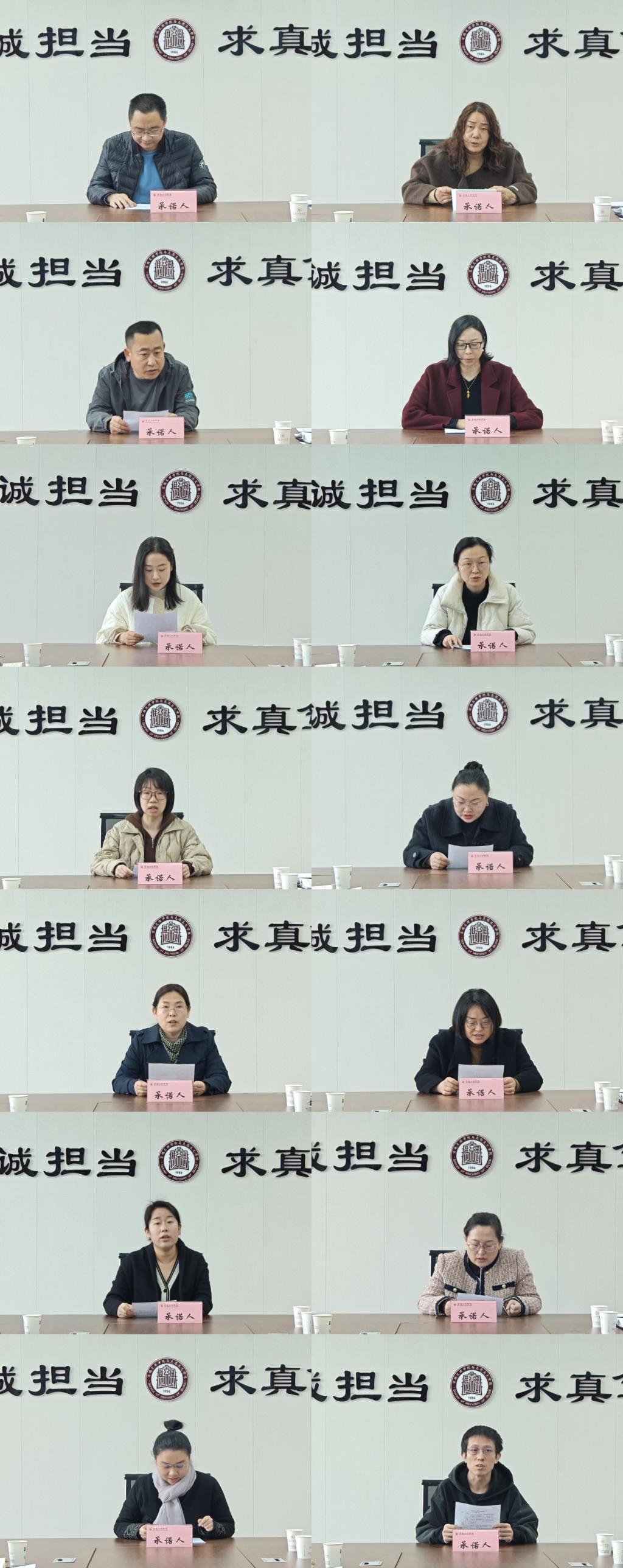 会上,学院各教研室主任、工会主席、教工党支部书记、科研基地负责人、青年博士分别围绕本年度工作成效、教学引领和科研示范等方面依次上台承诺汇报。学院其余教师现场签署2025年工作承诺书,全体教师签署了师德师风承诺书。