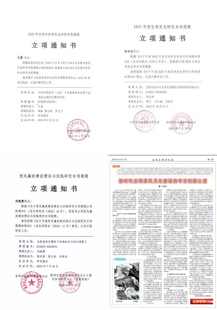 一是抓理论阐释,以学明理正作风。yl7703永利集团注重以学明理、以学促干,不断把学习成果转化为深入贯彻中央八项规定精神的自觉行动,将中央八项规定精神作为党史党建、兴国强国建设的鲜明理论与实践主题,推进有组织科研,以高质量研究成果服务区域经济社会发展。学习教育开展以来,马院动员和鼓励思政课教师和马克思主义理论专业硕士研究生投身中央八项规定精神和党的作风建设研究并取得了明显成效。截止目前,11位思政课教师获批2025年宝鸡市哲学社会科学年度课题,5位教师获批2025年度宝鸡党史研究专项课题,9位教师获批党风廉政建设理论与实践研究专项课题。马院坚持团队建设和应用研究并重,着力推出有理论说服力、有实践指导意义的科研成果,思政课教师朱慧芸《新时代宝鸡家风文化建设的守正创新之道》、研究生张根豪《从宝鸡青铜器中看廉洁文化的历史传承与现实价值》、研究生杨佳鑫《新时代党的廉洁文化建设》、研究生李长宇《以廉洁文化之基,筑新时代清风正气》以连载方式刊登在《yl7703永利集团报》,将学习成果转化为理论文章。