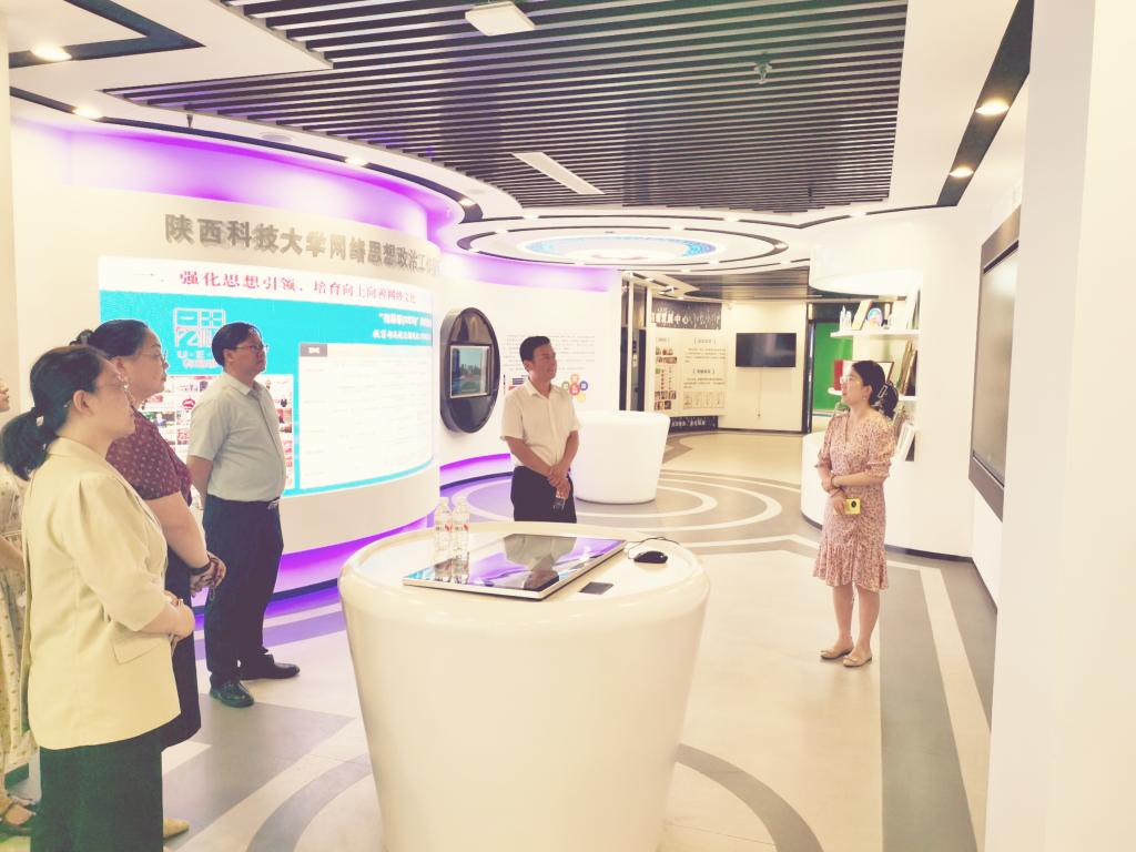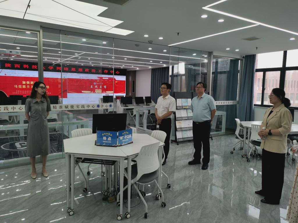 调研期间,调研组实地参观了陕西科技大学网络思想政治工作中心,学习“一轴两极三驱动”网络育人模式。该模式紧紧围绕立德树人根本任务,把握坚持用习近平新时代中国特色社会主义思想铸魂育人,将思政元素贯穿员工教育管理服务全过程“一轴”,推动教师主体和员工主体“两极”协同,聚焦精准化技术赋能、品牌化内容培育、系统化科学研究“三驱动”,实现网络育人的“软着陆”。