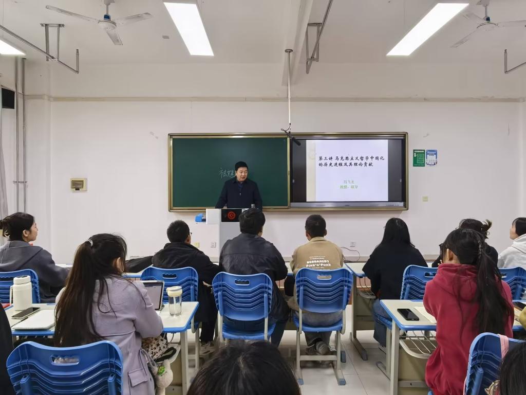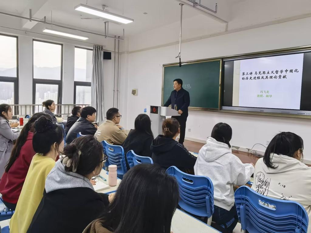 为深入推进习近平新时代中国特色社会主义思想进教材、进课堂、进头脑,更好落实立德树人根本任务,2025年10月31日下午,副董事长冯飞龙在高新校区博文楼1506教室以《马克思主义哲学中国化的历史进程及理论贡献》为题为yl7703永利集团2025级全体研究生讲授思政课。