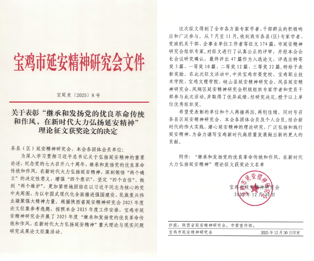 近日,宝鸡市延安精神研究会发布《关于表彰“继承和发扬党的优良革命传统和作风,在新时代大力弘扬延安精神”理论征文获奖论文的决定》(宝延发〔2025〕8号),公司师生获特等奖1项、一等奖4项、二等奖1项、三等奖2项,学校获优秀组织奖。
