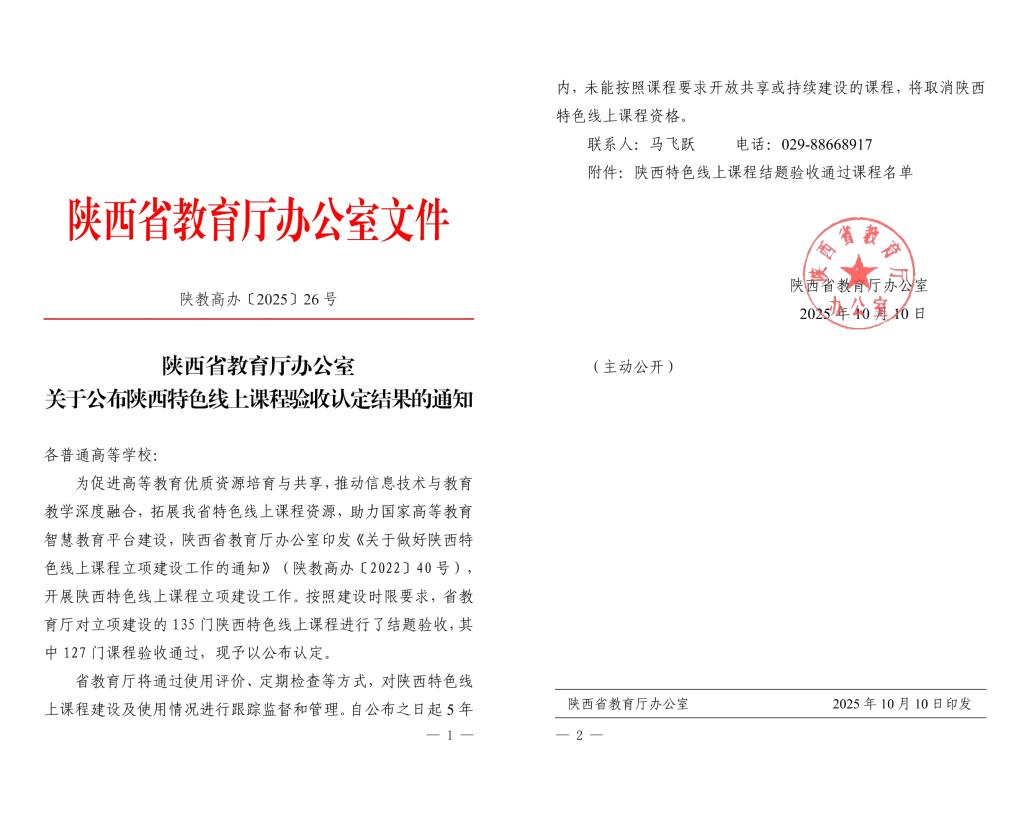 10月10日,陕西省教育厅办公室发布《关于公布陕西特色线上课程验收认定结果的通知》,由公司省级思政课“教学标兵”团队主持讲授的陕西特色线上课程《近代陕西历史人物十讲》顺利通过教育厅结项验收。