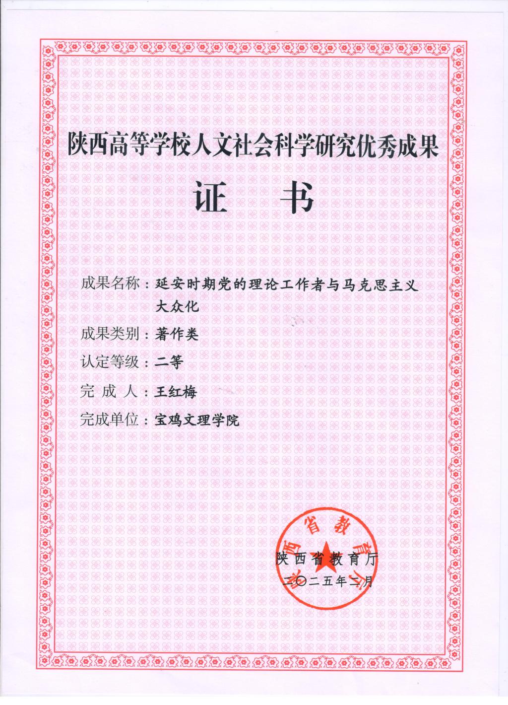 2月,陕西高等学校人文社会科学研究优秀成果奖揭晓,公司王红梅教授的著作《延安时期党的理论工作者与马克思主义大众化》获二等奖。