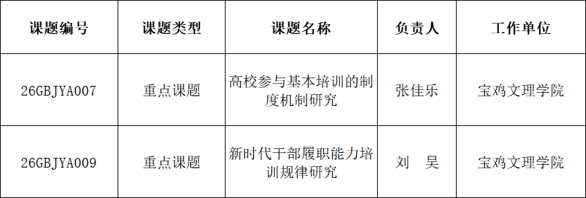 近日,延安大学官网发布了《关于2026年陕西省高等学校学科创新引智基地“干部教育国际交流引智基地”、陕西高校青年创新团队“红色资源与干部教育研究协同创新团队”联合开放课题立项的通知》,公司2024级硕士研究生刘昊、2025级硕士研究生张佳乐分别申报的“新时代干部履职能力培训规律研究”“高校参与基本培训的制度机制研究”课题获准立项。