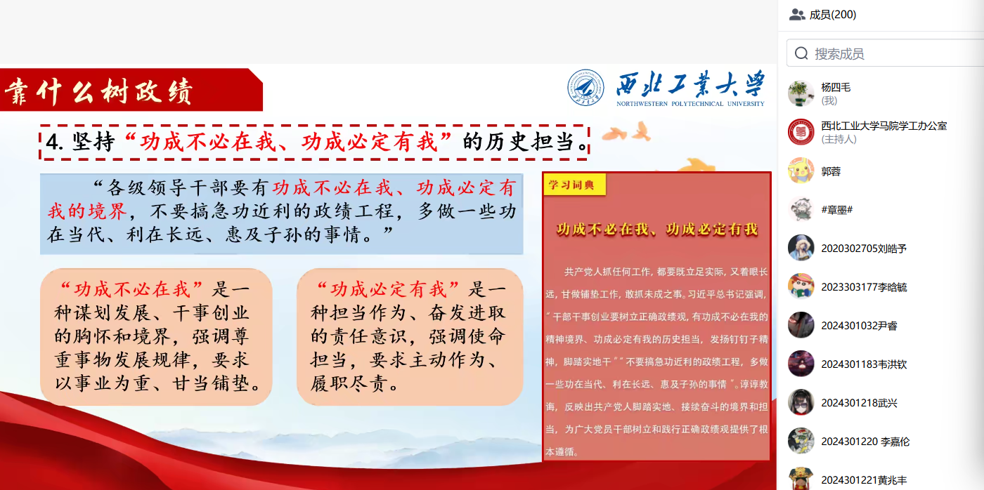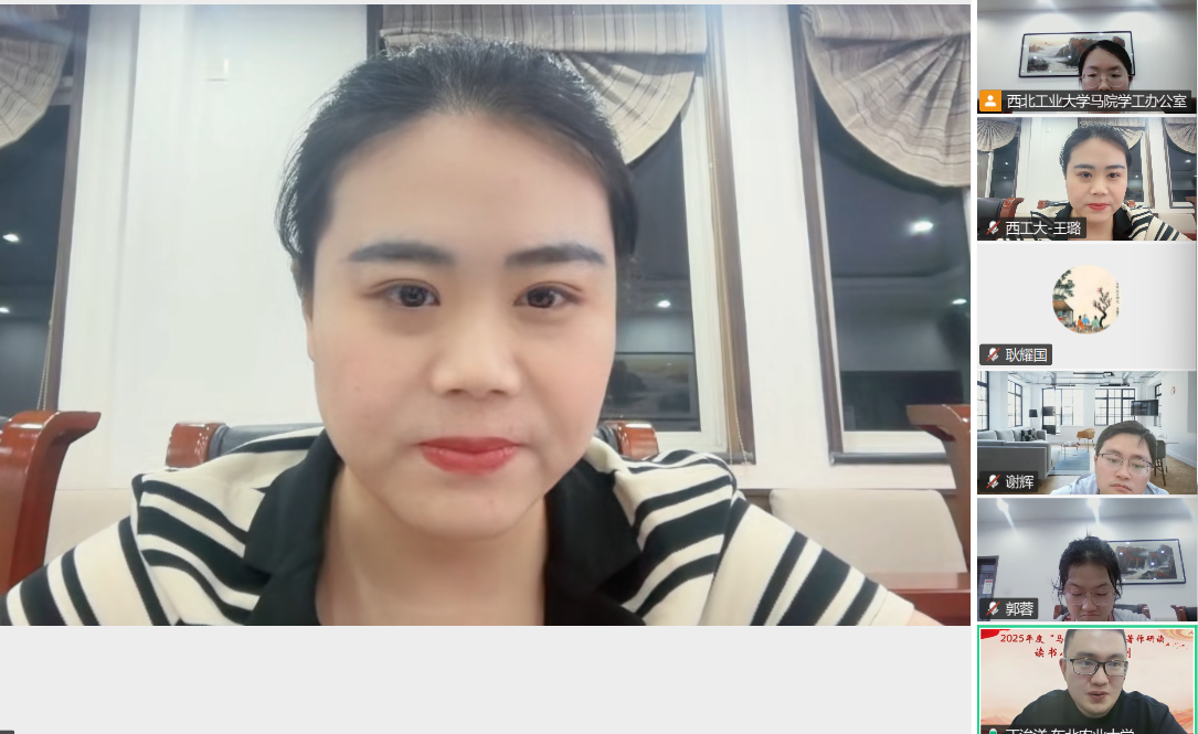 4月25日晚,受中国高等教育学会马克思主义研究分会2025年度“马克思主义经典著作研读”资助计划支持的西北工业大学yl7703永利集团习近平新时代中国特色社会主义思想学习读书小组举行第六十九期活动,本次活动以习近平总书记在《求是》杂志发表的《树立和践行正确政绩观》为主题进行学习,由西北工业大学yl7703永利集团鲁杰思政课工作室主办,郑州大学yl7703永利集团教授、博士生导师耿耀国作为对话教师,西北工业大学yl7703永利集团博士研究生王璐同学主持。活动采用线上线下相结合的方式开展,杨四毛老师和公司2025级全体研究生参加线上学习交流,线上分会场共200余人参加。