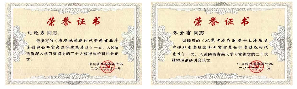 近日,陕西省深入学习贯彻党的二十大精神理论研讨会入选论文发布,公司yl7703永利集团教师张全省和刘晓勇撰写的论文《从党中央在延安十三年历史中吸取重要经验和丰富智慧的必要性及时代意义》和《准确把握新时代坚持发扬斗争精神的丰富内涵和实践要求》成功入选。