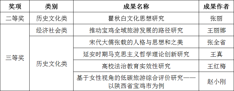 近日,宝鸡市第十七次哲学社会科学优秀成果评奖委员会办公室公布了“宝鸡市第十七次哲学社会科学优秀成果奖获奖成果”,公司张丽副教授荣获历史文化类二等奖,张全省教授、王真教授和王红梅副教授荣获历史文化类三等奖,王丽娜老师荣获经济社会类三等奖,赵小刚老师参与的成果荣获经济社会类三等奖。