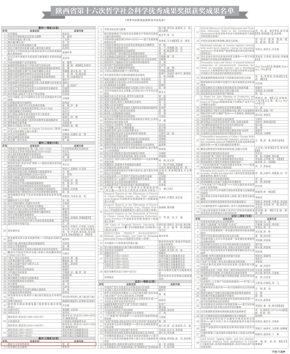陕西省哲学社会科学优秀成果奖由陕西省人民政府发起设立,是陕西省哲学社会科学界规格最高的政府奖,每两年评选一次,成果形式分为著作类、论文类、智库报告类。本次评选经过申报、审查、初评、终评、公示等评奖程序,共产生418项(含并列成果12项)获奖成果,其中:著作143项(含古籍整理7项,科普读物5项,志书4项),论文210项,智库报告65项。