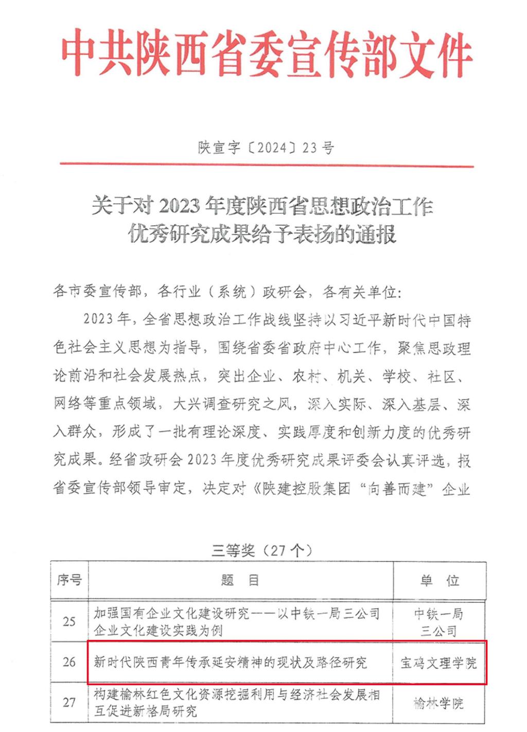 据悉,2023年度陕西省思想政治工作研究成果评选活动由中共陕西省委宣传部、陕西省思想政治工作研究会联合开展,全省共评选优秀研究成果54篇(含一等奖9篇、二等奖18篇、三等奖27篇)。