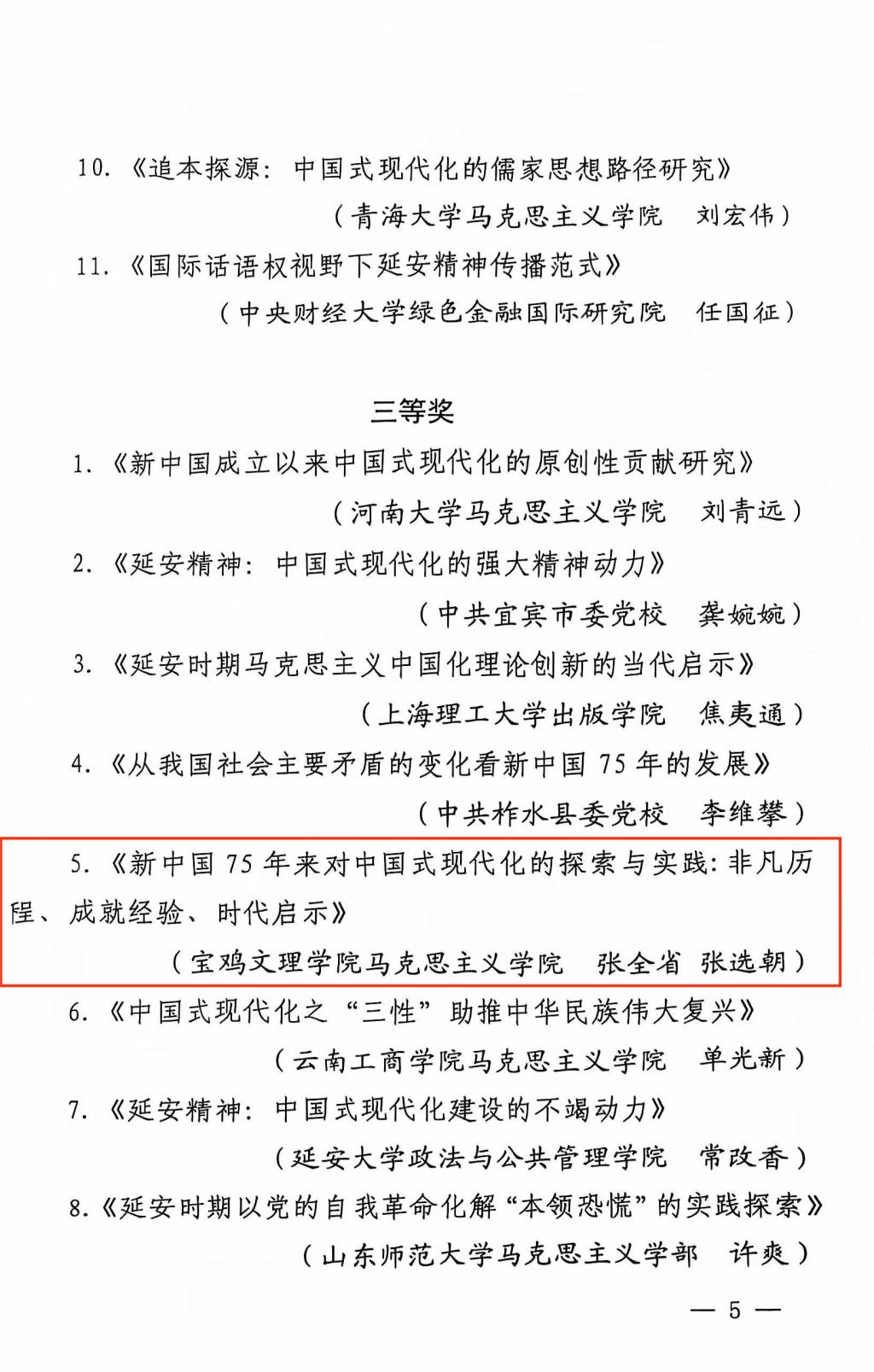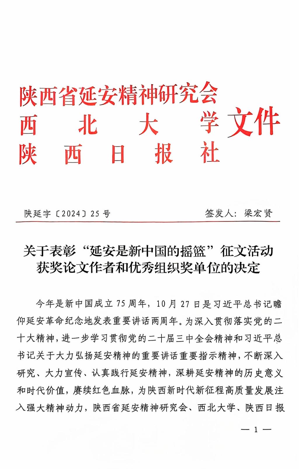 近日,由陕西省延安精神研究会、西北大学、陕西日报社联合主办的“延安是新中国的摇篮”专题研讨会在西安召开,会上表彰了“延安是新中国的摇篮”征文活动获奖论文作者和优秀组织奖获奖单位,公司张全省、张选朝两位老师合著文章《新中国75年来对中国式现代化的探索与实践:非凡历程、成就经验、时代启示》荣获本次征文活动三等奖。