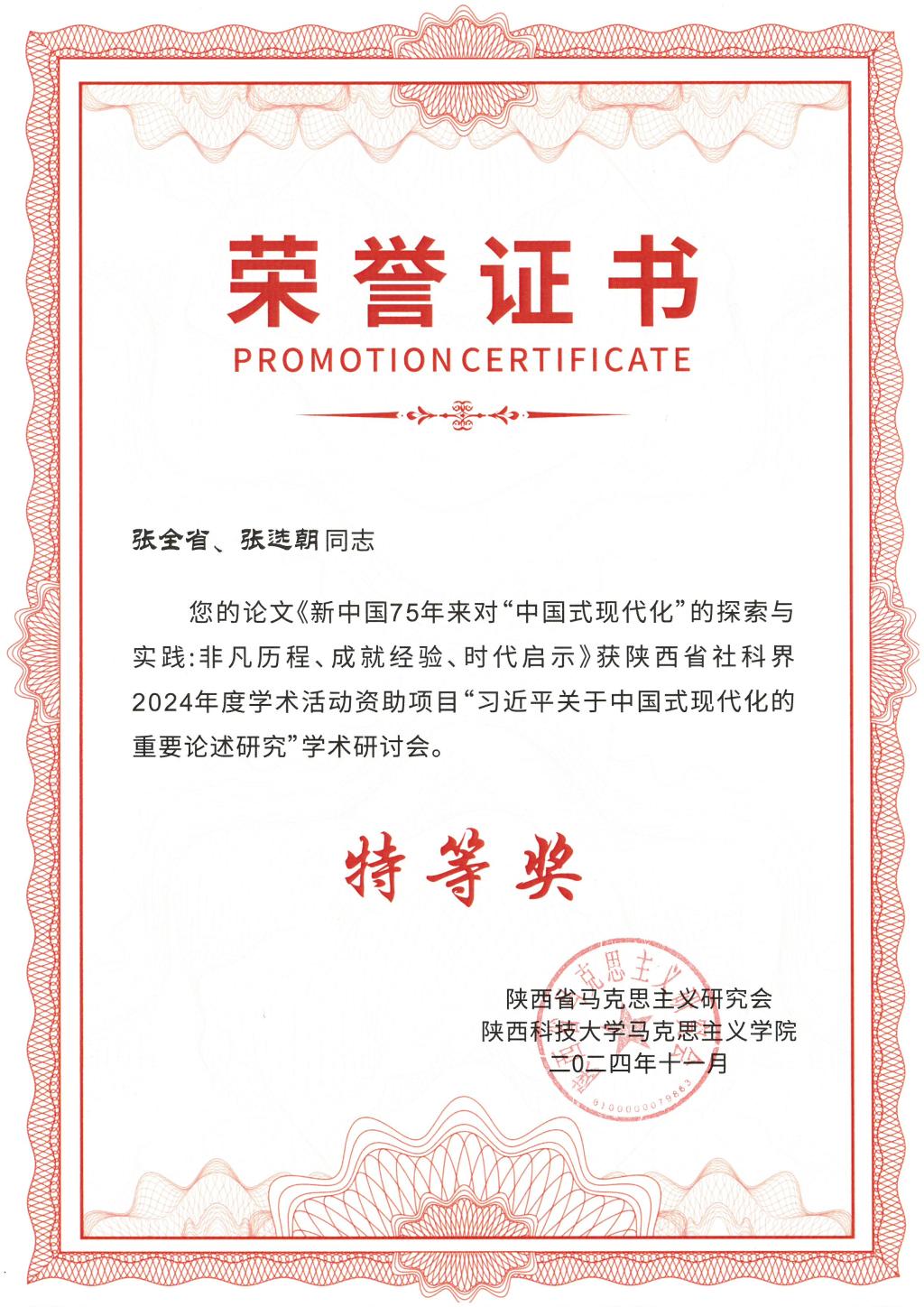 近日,陕西省马克思主义研究会、陕西科技大学yl7703永利集团联合发布《“习近平关于中国式现代化的重要论述研究”学术研讨会优秀论文表彰决定》,公司张全省、张选朝老师合撰的《新中国75年来对“中国式现代化”的探索与实践:非凡历程、成就经验、时代启示》荣获“习近平关于中国式现代化的重要论述研究”学术研讨会论文特等奖。