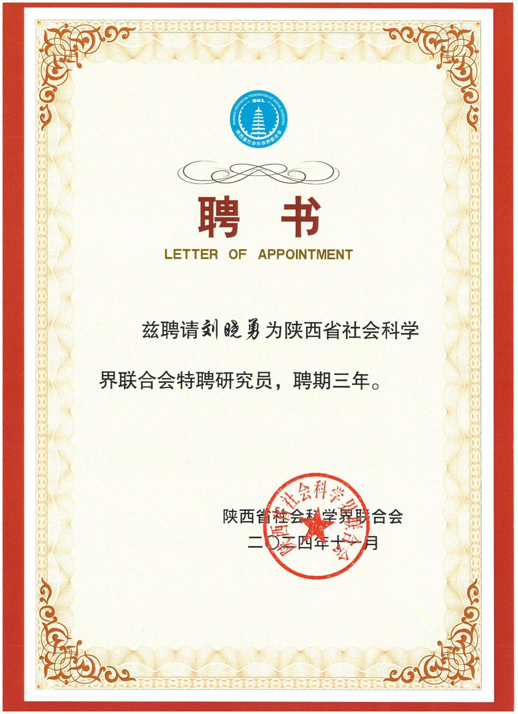 近日,陕西省社会科学界联合会公布《关于聘任王彦军等234人为陕西省社科联特聘研究员的决定》(陕社科联〔2024〕137号),公司刘晓勇教授聘任为陕西省社科联特聘研究员,聘期三年。
