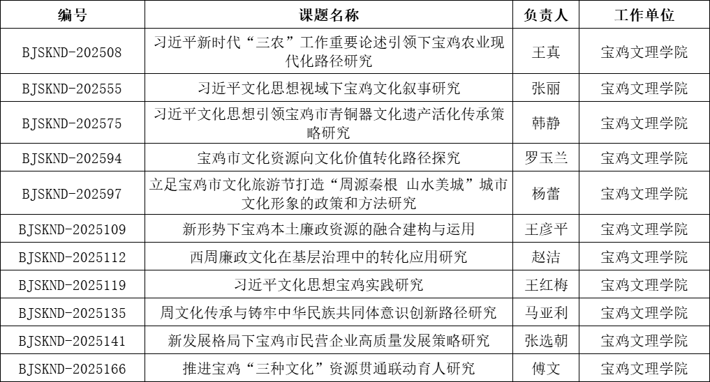 近日,宝鸡市社会科学界联合会发布了《关于2025年宝鸡市哲学社会科学年度课题立项的通知》,马克思主义学院共有11项课题获批立项。