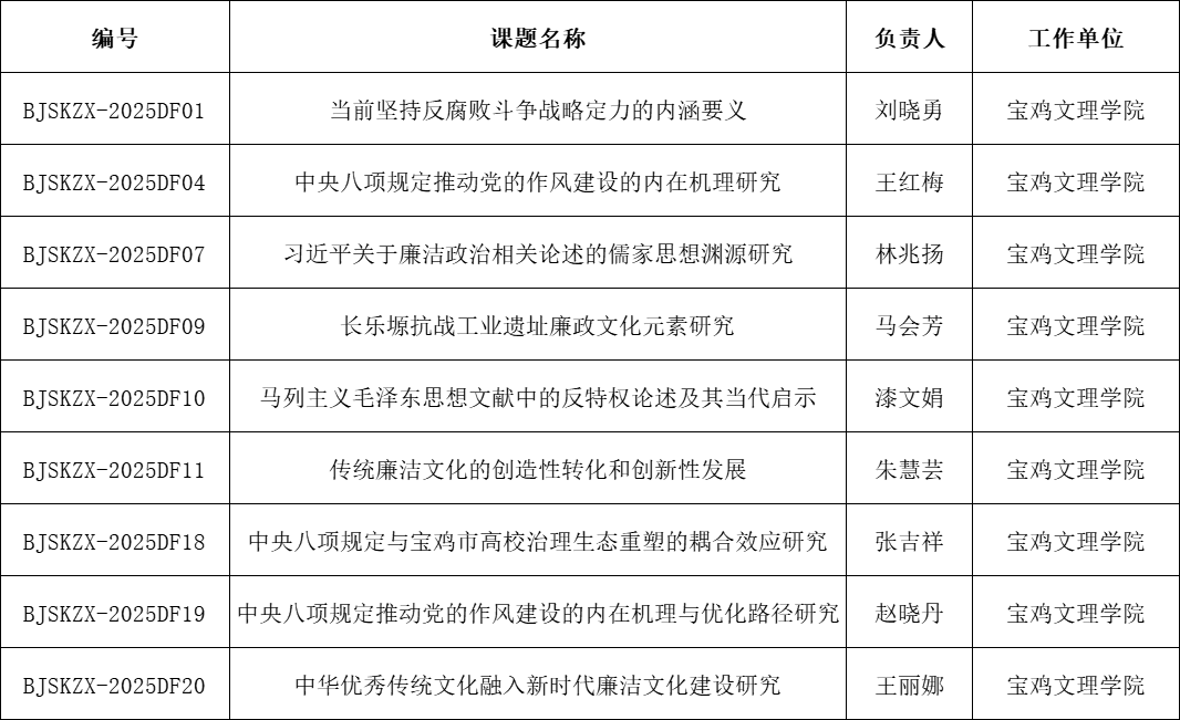 据悉,本次课题由宝鸡市社会科学界联合会与陕西省重点中国特色社会主义理论体系研究中心(宝鸡基地)联合开展,旨在贯彻落实二十届中央纪委四次全会精神和深入贯彻中央八项规定精神学习教育,全面落实陕西省第十四届纪律检查委员会第四次全体会议精神的核心要义、实践经验和经验启示。经专家评审共有21个项目获准立项。