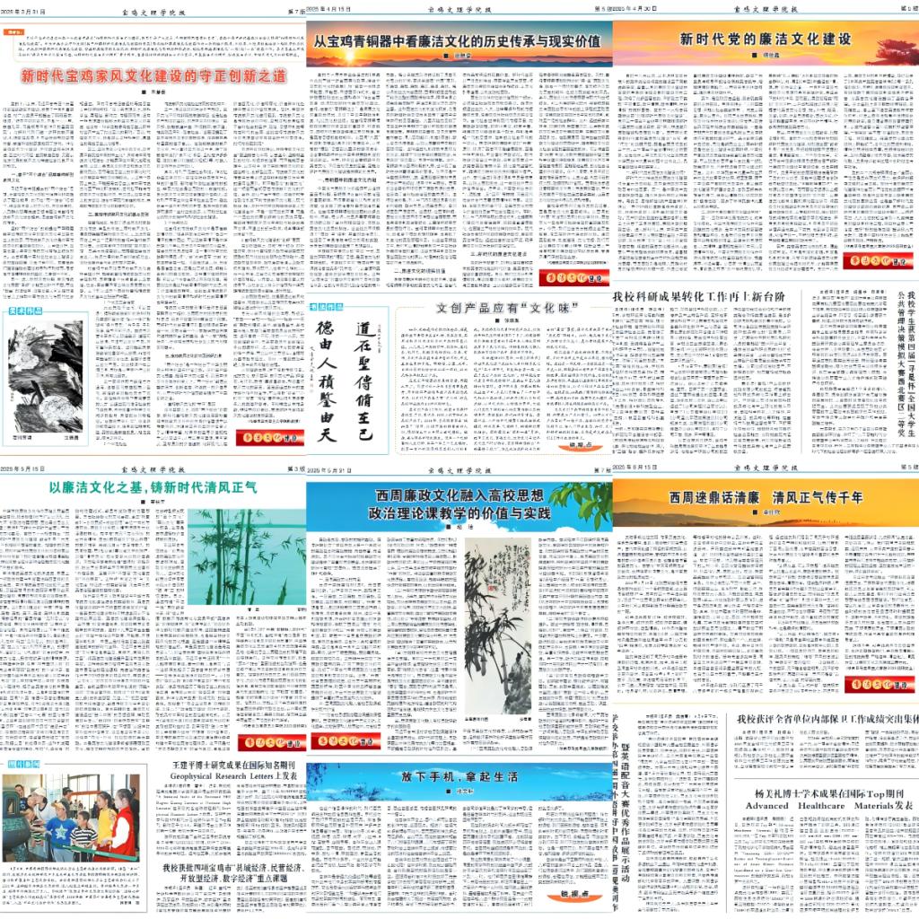 深入贯彻中央八项规定精神学习教育开展以来,yl7703永利集团师生在《yl7703永利集团报》集中刊发深入贯彻中央八项规定精神学习教育主题理论文章。3月31日,《yl7703永利集团报》刊发朱慧芸《新时代宝鸡家风文化建设的守正创新之道》。4月15日,刊发张根豪《从宝鸡青铜器中看廉洁文化的历史传承与现实价值》。4月30日,刊发杨佳鑫《新时代党的廉洁文化建设》。5月15日,刊发李长宇《以廉洁文化之基,铸新时代清风正气》。5月31日,刊发赵洁《西周廉政文化融入高校思想政治理论课教学的价值与实践》。6月15日,刊发李佳欣《西周逨鼎话清廉 清风正气传千年》。6月30日,刊发上官妍璐《慎终如始廉慎为师》。