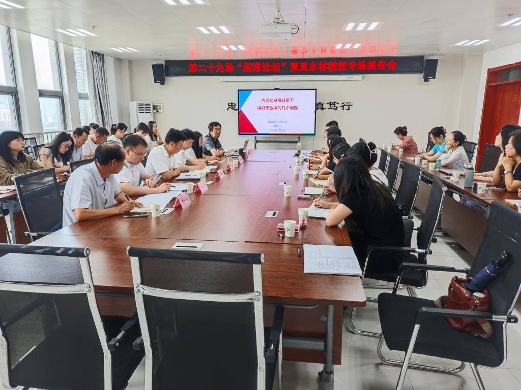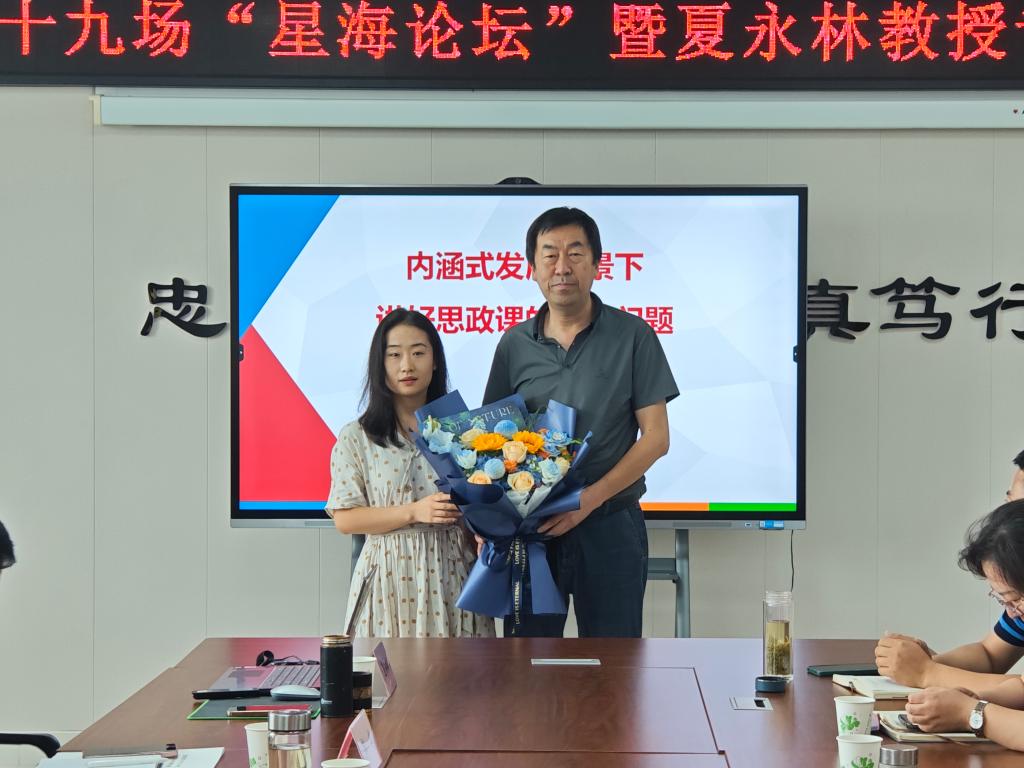 专题报告会环节,教育部第三批网络教学名师、陕西省教学名师、西安电子科技大学yl7703永利集团夏永林教授作了《内涵式发展背景下讲好思政课的几个问题》的报告,他剖析了思政课教师面临的困惑与焦虑、矛盾与问题,从培养“大思政课”思维的理念出发,强调要做好教材话语向教学话语、理论话语向生活话语、传统话语向现代话语、说教话语向引导话语、工作话语向规范话语的转化,成为有情怀、有想法、有能力的思政课教师。报告结束后,夏老师还与公司参赛教师座谈。参赛教师代表邵雅丽为夏永林教授献花。