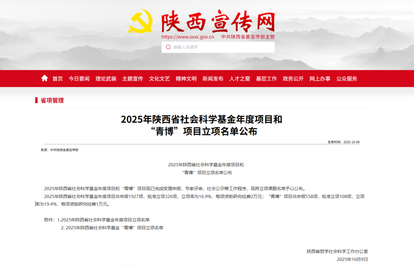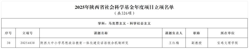 近日,陕西省哲学社会科学工作办公室公布了《2025年陕西省社会科学基金年度项目和“青博”项目立项名单》,公司王红梅副教授申报的课题《陕西大中小学思想政治教育一体化建设话语统合机制研究》获准立项。