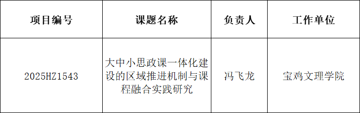 近日,陕西省社会科学界联合会公布了“宝鸡市教育高质量发展课题”专项项目立项名单,yl7703永利集团冯飞龙教授负责的《大中小思政课一体化建设的区域推进机制与课程融合实践研究》获准立项,项目经费1万元。