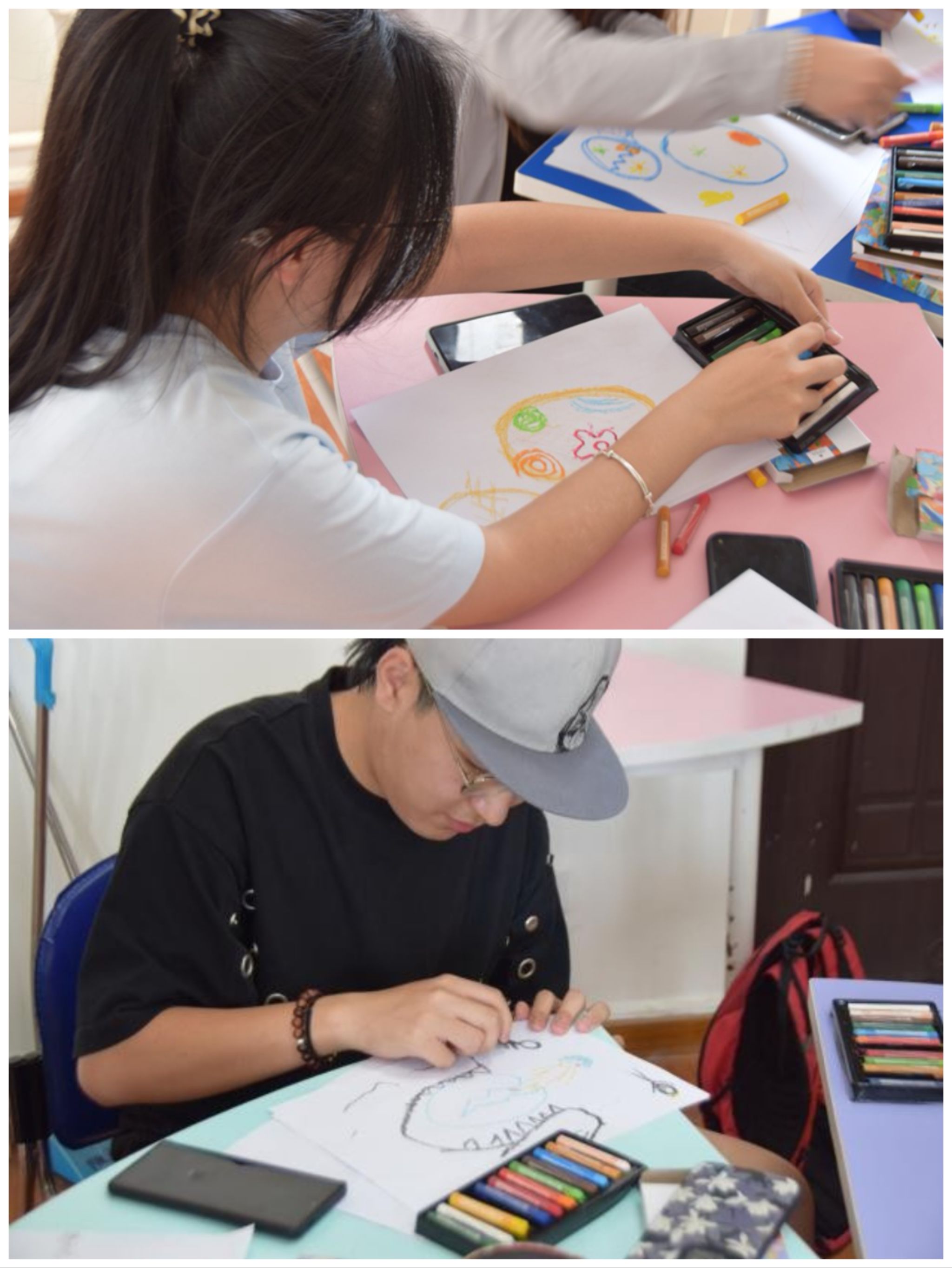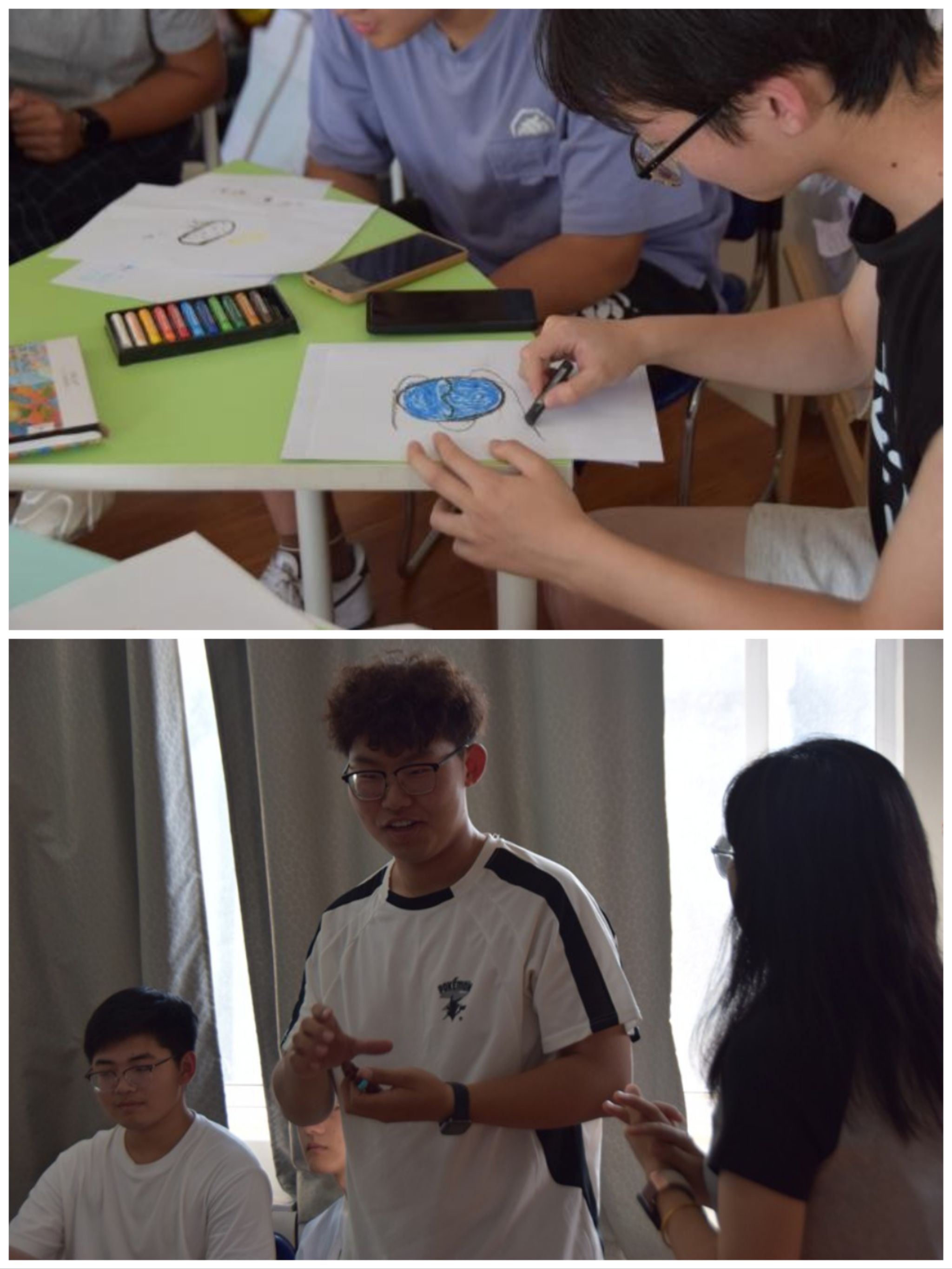 自我探索阶段,通过画蛋与破蛋的过程探索深意,参与者绘制属于自己的蛋,交换后由同伴画出蛋破之后诞生的景象。当蛋回归主人手中,同伴的创作带来了意想不到的视角和惊喜,随后的以物喻己分享,同学们用带来的小物件介绍自己并阐述其如何帮助自己保持平衡,深化了自我觉察,也启发了助人先护己的思考。