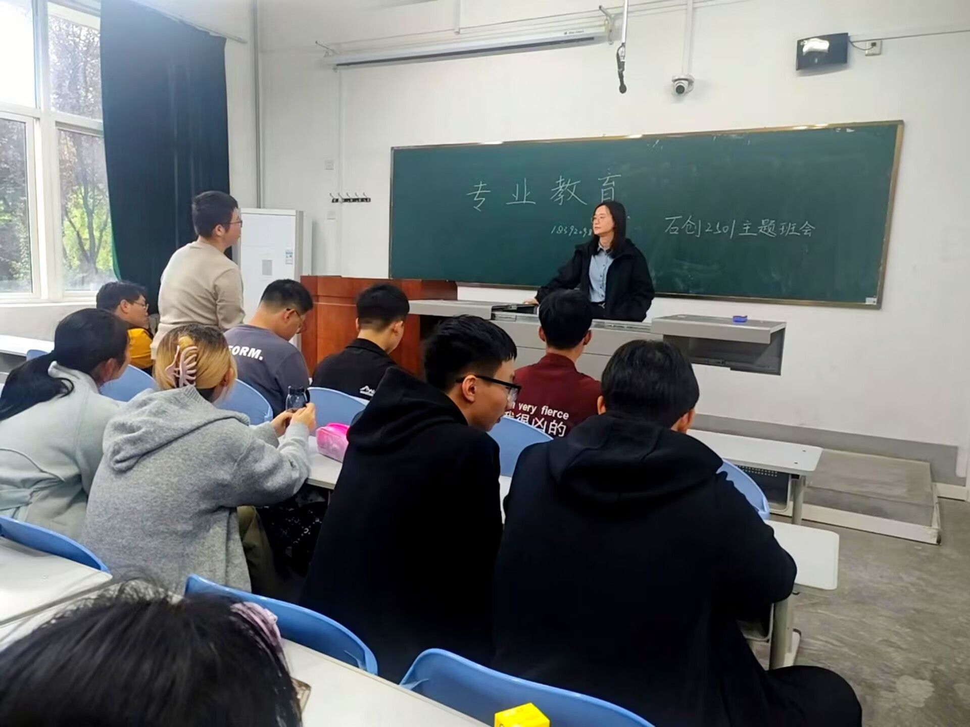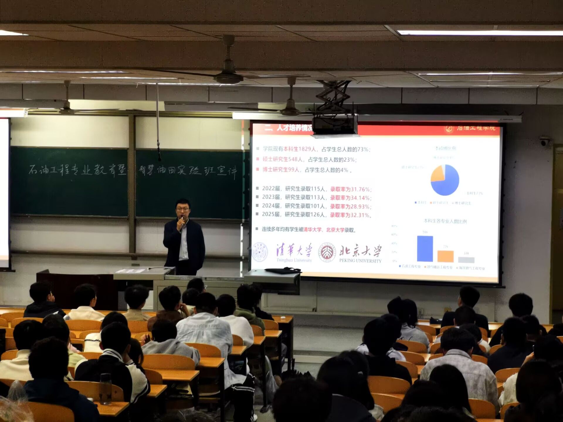 10月11日下午,王琛在博览楼A139为石工卓越2501、2502班和石工2501—2506学生开展专业教育。他详细介绍了学院整体情况,人才培养情况和教学改革创新方面的基本情况。重点围绕学院近年来在教学改革方面的举措,包括设立“智慧油田实验班”,以“油气工程+人工智能”为特色,通过小班化、前沿性教学模式,培养兼具工程实践能力和创新思维的高层次人才。他鼓励学生充分利用学院资源,积极参与学科竞赛和科研项目,提升国际化视野与跨学科能力