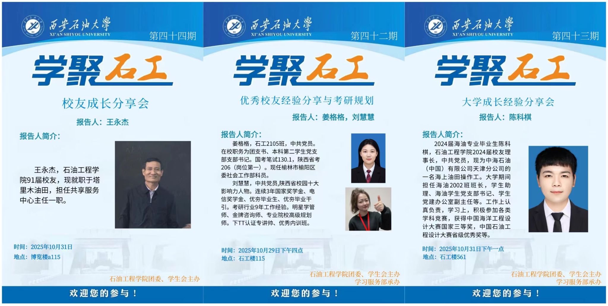 10月31日,学院邀请石油工程91届校友王永杰现任塔里木油田共享服务中心主任),结合30余年行业经验和人生感悟,与2024级学生深入交流“大学成长与职业发展”邀请2024届校友陈科棋(现任职中海石油天津分公司职员)以“海上油田操作工”为例,从学生工作、求职技巧到职业发展路径,为2023级学弟学妹提供贴近实际的“定制化”指导
