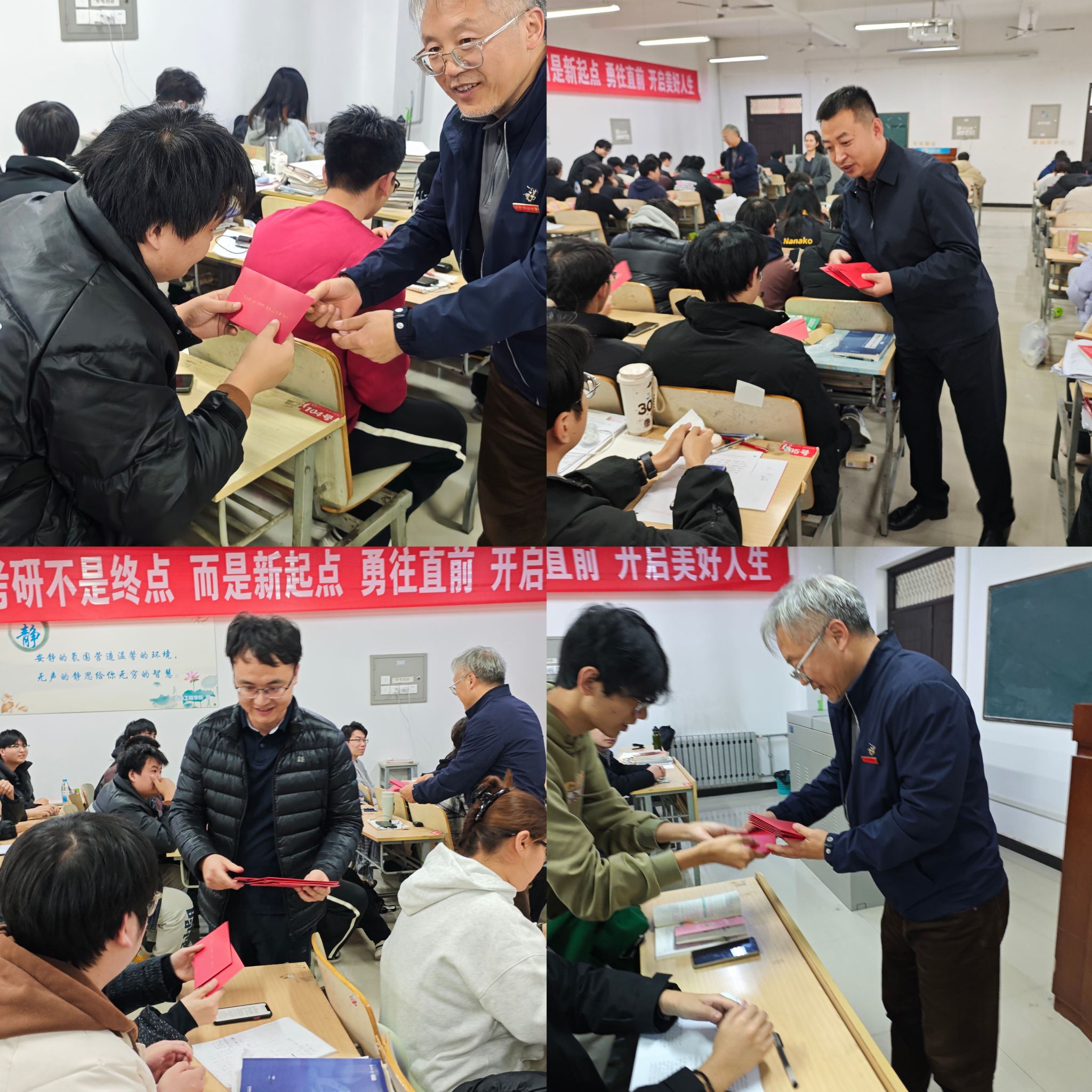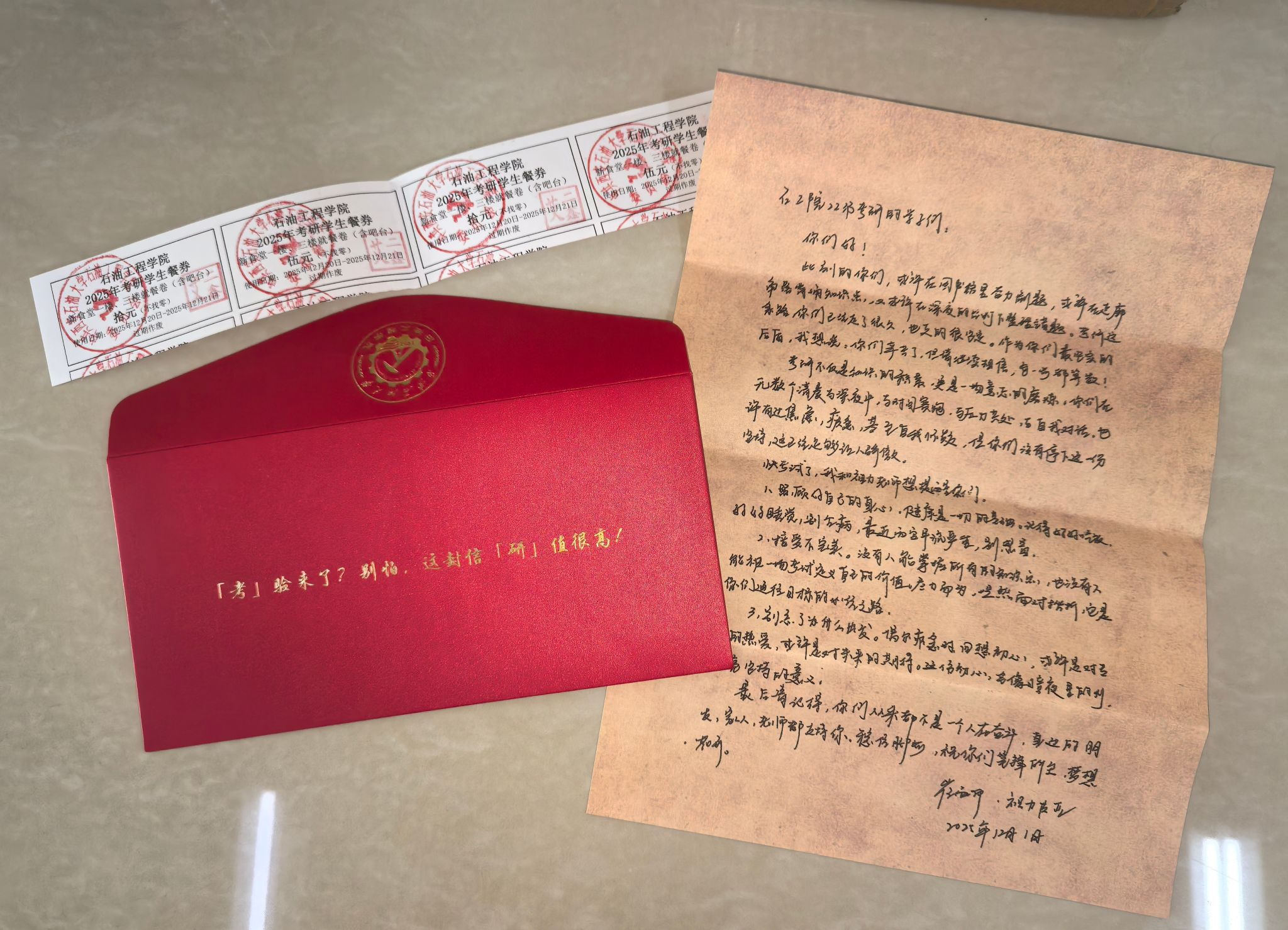 活动上,学院领导与老师们将饱含期许的礼物亲手递至备考学子手中一封红色信笺寄寓鸿运当头之祝愿,封面考研锦囊字样凝结智慧,封口处院徽如印,静静烙下学院的牵挂与嘱托。考虑到考试期间通讯与用餐多有不便,学院特备暖心餐票,护航学子安心落笔尤为珍贵的是,2026届毕业班辅导员为每位考生亲笔书写信函字里行间流淌真情,纸短情长蕴藏深意,让温暖的陪伴跨越考场内外,成为每一位学子身后无声却坚实的港湾。