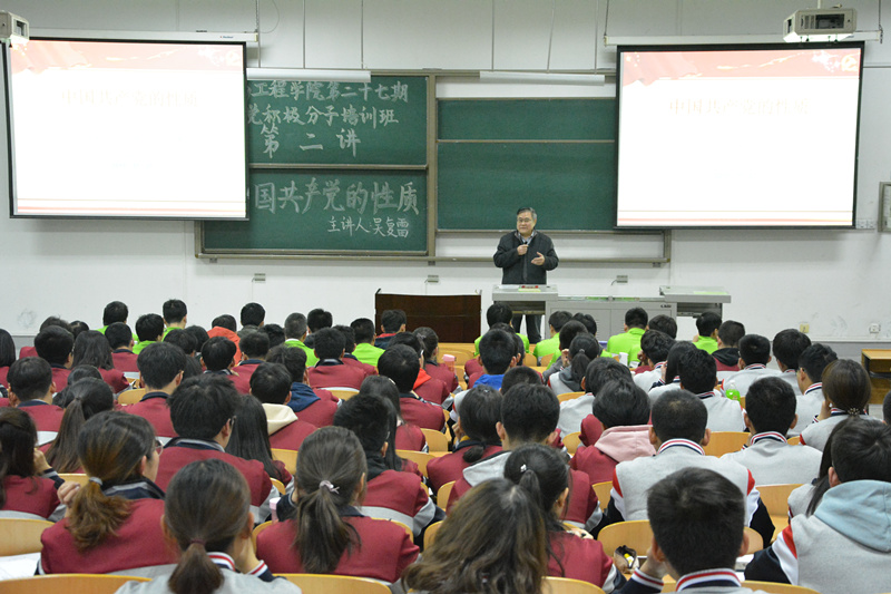 课程开始,吴复雷老师先从历史的角度结合马克思主义理论系统阐述了政党和政党制度的定义及特性。之后吴老师重点讲述了历届具有转折性的中国共产党全国代表大会对党的性质的定义,并阐述了党的最高及最低纲领及“三个代表”提出的背景。最后,吴老师以“明确党的性质,确立终生政治信仰”为题教导在场所有入党积极分子要了解和认识中国共产党,从思想上入党,完成从自然人到社会人的转变,确定自己的政治信仰和追求。