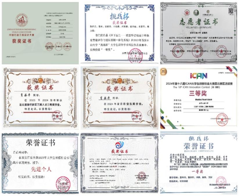 学习之余,她积极参加科研竞赛,不断提升自己的学术研究能力和创新精神。获得第十八届iCAN大学生创新创业大赛中获西北赛区三等奖、中国石油工程设计大赛中获钻井工程设计省级优秀奖、中国国际大学生创新大赛陕西省铜奖等奖项。