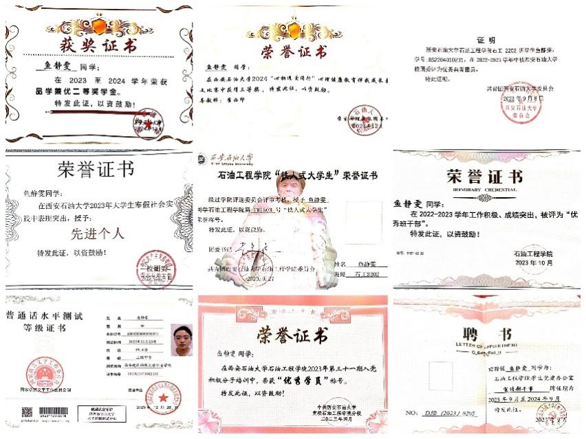 鱼静雯,女,汉族,出生于20043月,陕西咸阳人,中共党员,yl7703永利集团2022级石油工程专业2202班学生。现任班级团支书,曾任学院融媒体中心副主任。现已成功保研至yl7703永利集团攻读硕士研究生。