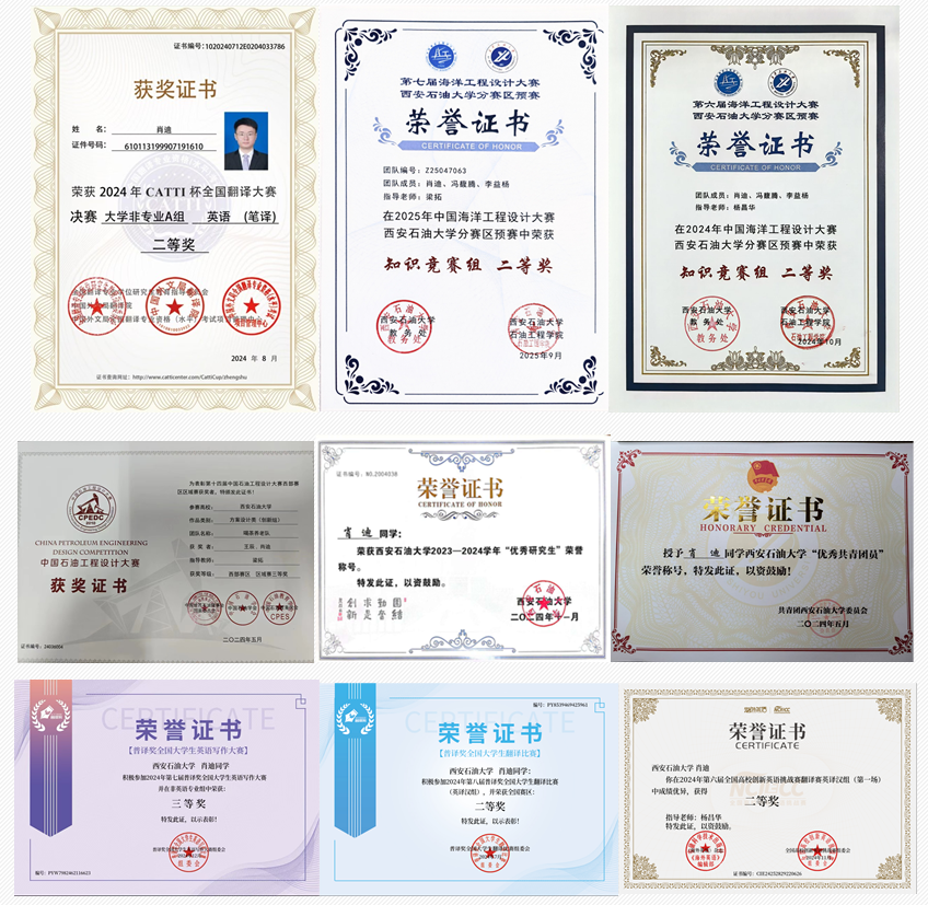 在实践能力上,获得2024年中国石油工程设计大赛区域三等奖,第六届、第七届海洋工程知识竞赛校级二等奖,CATTI全国英语翻译大赛二等奖,2024普译奖翻译大赛全国二等奖、写作二等奖,2024全国高校英语翻译挑战赛全国二等奖及其他奖项若干。