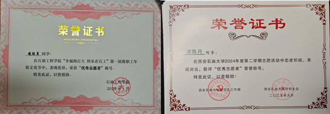 越是艰苦,越要奋斗,越要奉献,这是石油人的底色,也是青年的本色。作为石油与天然气工程专业的研究生,她始终以“深耕学术、践行担当”为准则,在钻研油气技术的同时,积极投身各类志愿服务,让研究生涯兼具深度与温度。在学术上,努力学习专业知识,扎根实验室,积极产出成果,发表权威论文两篇,同时积极参与志愿活动,服务同学,为学院发展贡献个人力量。
