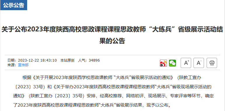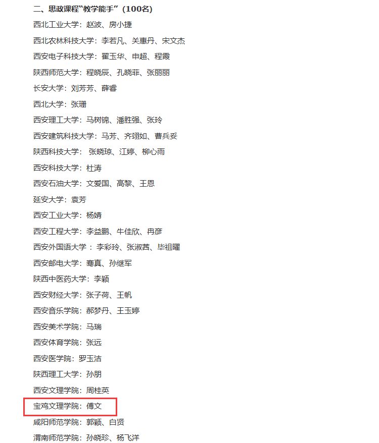 近日,中共陕西省委教育工委发布了《关于公布2023年度陕西高校思政课程课程思政教师“大练兵”省级展示活动结果的公告》,公司yl7703永利集团杨蕾老师荣获思政课程“教学标兵”荣誉称号,傅文老师荣获思政课程“教学能手”荣誉称号。公司获奖数量持续增长,成绩继续位居全省高校前列。