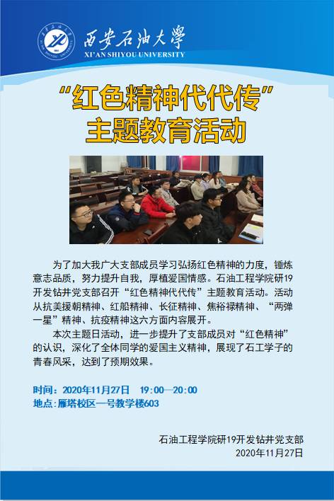 为了深入学习和弘扬红色精神,锤炼意志品质,厚植爱国情感。20201127日晚七点,yl7703永利集团研19开发钻井党支部在雁塔校区第一教学楼会议室召开“红色精神代代传”主题教育活动,石工院研究生辅导员老师、党支部副书记张楠老师及20余支部成员参与了本次活动。